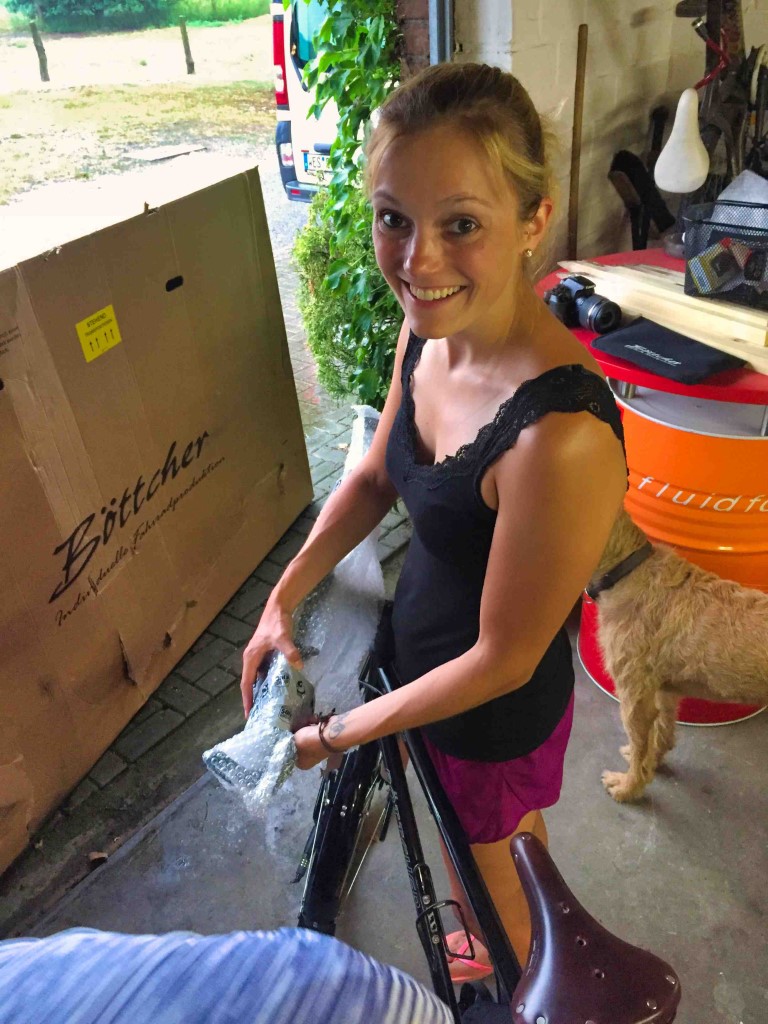 Man muss sagen: die Kartons waren schon beeindruckend! Keiner von uns hat je einen so großen Karton bekommen, da muss man erst mal rausfinden, wie man den jetzt am besten geöffnet bekommt. Wo Gewalt nicht hilft, hilft ja bekanntlich mehr Gewalt und so wurde der erste Karton voller Ungeduld aufgerissen. Da sich unsere beiden Fahrräder lediglich in der Rahmengröße und der Sattelfarbe unterscheiden, wurde zunächst ein Blick auf den Sattel geworfen und da dieser braun war, war dies Marielles Fahrrad. Marielle wunderte sich zwar kurz darüber, dass der Sattel so lang war und so hell, laut ihrer Erinnerung hätte dieser viel dunkler und kürzer sein müssen, aber gut. Da Henning einen schwarzen Sattel bestellt hatte, musste sie das falsch im Kopf haben. Also wurde noch der Lenker in die richtige Position gedreht, die Pedalen angeschraubt und dann der Sattel eingestellt. Tja und hier tauchte plötzlich ein gewaltiges Problem auf. Denn selbst, wenn der Sattel in der tiefsten Position eingestellt war, kam Marielle grade mal mit den Zehenspitzen auf den Boden. Scheiße! Doch die falsche Rahmengröße bestellt? Aber wir hatten doch extra einen Fachhändler gefragt und es sogar nochmal ausgemessen! Scheiße! Denn so schön handgefertigte, individuelle Fahrräder sind, mal eben einfach zurückgeben, kann man die nicht.