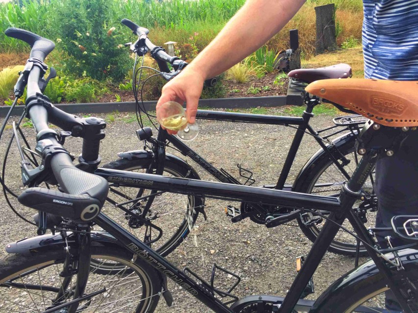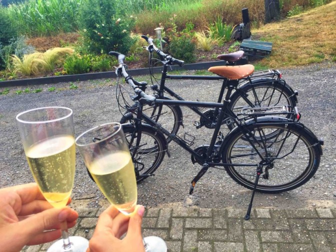 Dann wurde zur Feier dieses besonderen und für uns sehr wichtigen Ereignisses noch mit einem Glas Sekt für jeden angestoßen. Hennings Vater Rudi behielt zum Glück das Wesentliche im Blick und so wurden unsere neuen Reisebegleiter dann auch noch getauft. So wie es sich gehört. Marielles Fahrrad bekam sofort den Namen „Klein Enmo“ verpasst. Ihr aktuelles Auto hat als Nummernschild EN-MO, weshalb es immer Enmo genannt wird und als Andenken an das Auto, was dann natürlich weg kommt, wenn es los geht, und weil unsere Fahrräder ab April nächsten Jahres ja quasi unsere neuen Autos sind, so wie unser Zelt zu unserer Wohnung wird. Hennings Radl bekam den Namen „Hagen“, weil der Träger vorne über dem Vorderrad laut Henning wie ein Haken aussieht und er daraus dann eben Hagen gemacht hat. Laut Marielle sieht das ganze zwar eher wie ein Rundbogen aus, aber das liegt vielleicht im Auge des Betrachters. Und da es Hennings Rad ist, werden wir ab jetzt von unsere Reisebegleitern Klein Enmo und Hagen begleitet.
