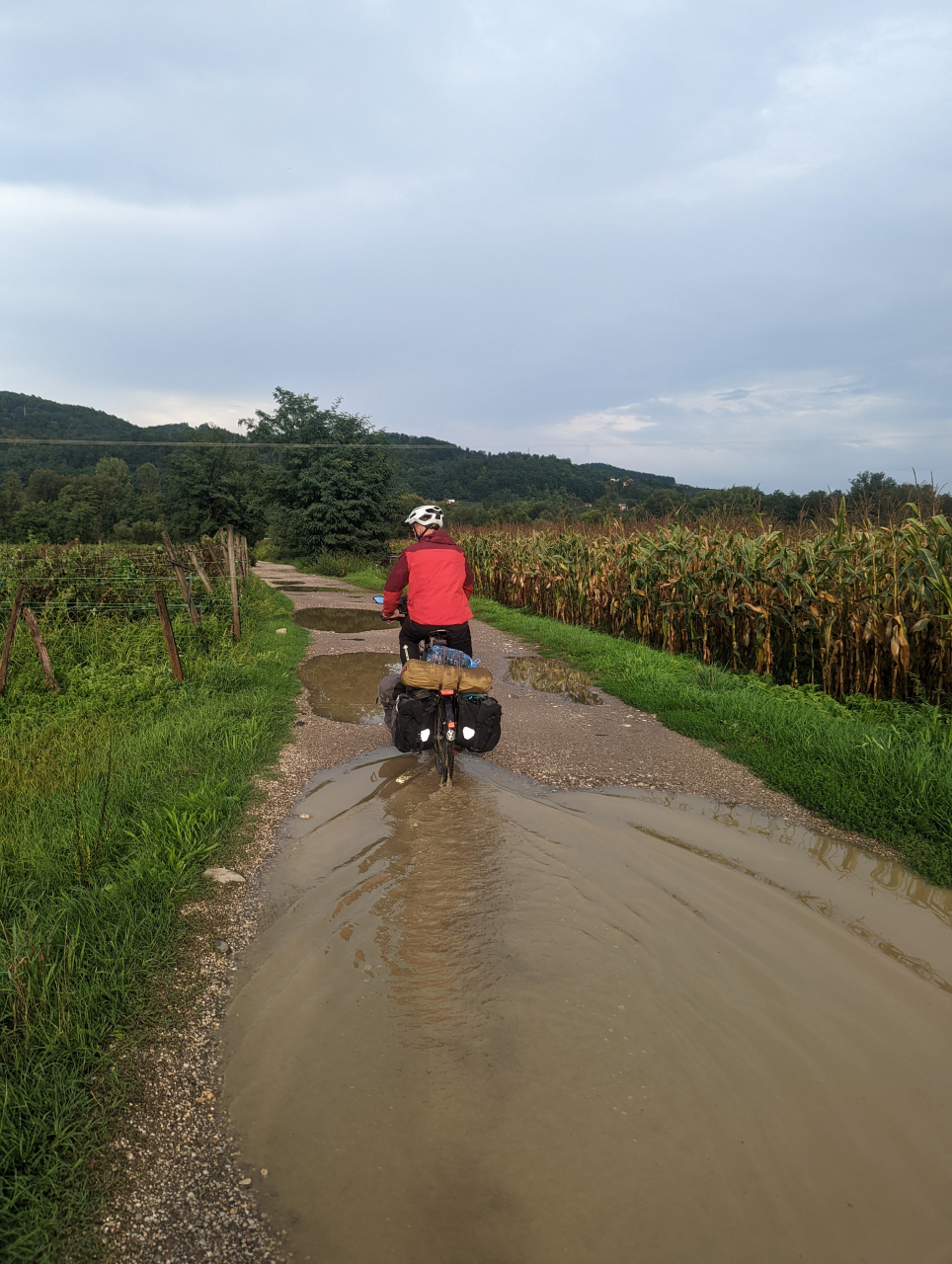 Wir reisten also nach Serbien ein, um dieses Land zu queren und von hier weiter nach Rumänien zu fahren. In den ersten Tagen überraschte uns Serbien nicht nur mit schlechtem Wetter. Der Herbst war spürbar im Anmarsch und es regnete immer wieder. Da die Straßen in Serbien allgemein in einem sehr schlechten Zustand sind, führte das häufig dazu, dass nicht nur wir für die Dauer des Regens nicht wirklich weiterfahren konnten, sondern ebenso wenig die Autofahrer. Die Straßen liefen einfach voll und standen unter Wasser. (Uns wurde erklärt, dass die Straßen nie so gebaut werden, wie es Vorschrift wäre, da aufgrund von Korruption ein Großteil der Gelder für den Straßenbau auf unbekannte Weise verschwindet, sodass für eine qualitativ vernünftige Straße zu wenig Geld bleibt.) Außerdem waren wir irgendwie nicht darauf vorbereitet, dass Serbien so bergig ist. Wir waren zwar von Montenegro mehr als trainiert, was das Thema Höhenmeter anging, aber innerlich hatten wir uns beide darauf eingestellt, dass es in Serbien flach werden würde. Vermutlich auch, da wir 2018 bereits mit den Fahrrädern in diesem Land unterwegs gewesen waren und bis auf die Region nahe der kroatischen Grenze, wo wir uns urplötzlich in Weinbergen wiederfanden, waren wir damals fast nur flach gefahren. Sehr wahrscheinlich hatte das aber auch viel mit dem Umstand zu tun, dass wir zu dem Zeitpunkt einen großen Teil an der Donau gefahren waren.